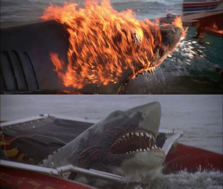 The Shark in Jaws 2 also has a deformity. After devouring the water skier, the Shark turns its attention to the speedboat, where the panicked driver attempts to throw gasoline on the shark (and herself in the process). She shoots the Shark in the face with a flaregun, setting fire to part of the Shark's mouth and face along with the driver and the boat, which then explodes. A shark is already a terrifying sight to see while swimming. Burn part of its face off and it is even more terrifying. Again there is no topping the original Jaws, but it does give this Shark character. Scarface the Shark.