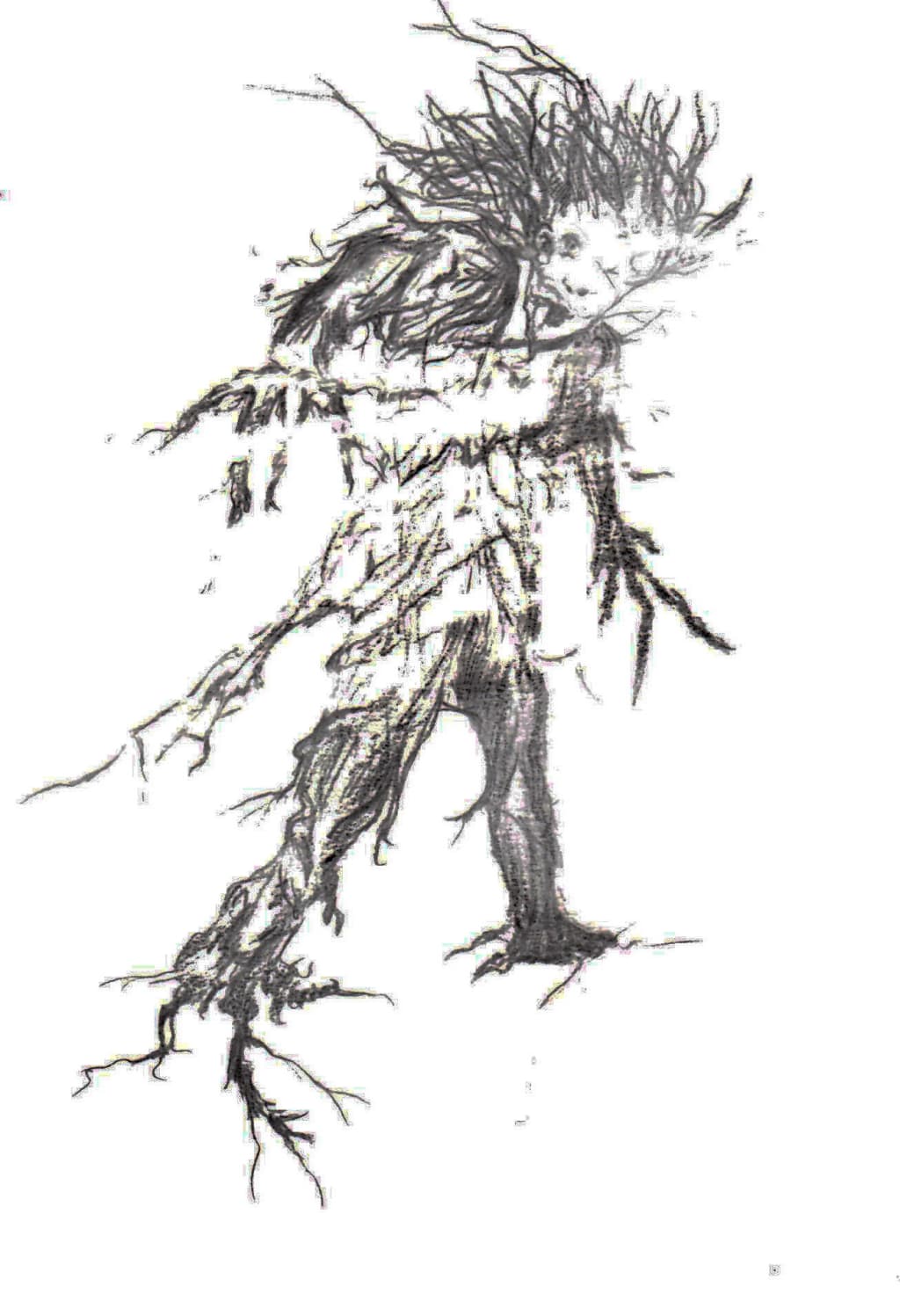 Eric froze in terror. He could hardly breathe. On the floor, by his feet, roots stretched out to him from long slender slumps that split in two. At the center they joined with a long thick truck the birthed branches at either sides. They were broken, bent inwards and wrapping themselves around something they secured tightly to their trunk. The object they secured was long, slender, and made of iron. The end of which buried itself in a great bulbous knot that centered between each branch. Eric slowly crept forward and wrapped his fingers in between tiny roots that webbed and weaved in amongst themselves along the crown of this bulbous abomination. And, as he slowly bent it backwards, he saw that the long, slender object that had planted itself into it was that of the barrel of a shotgun.