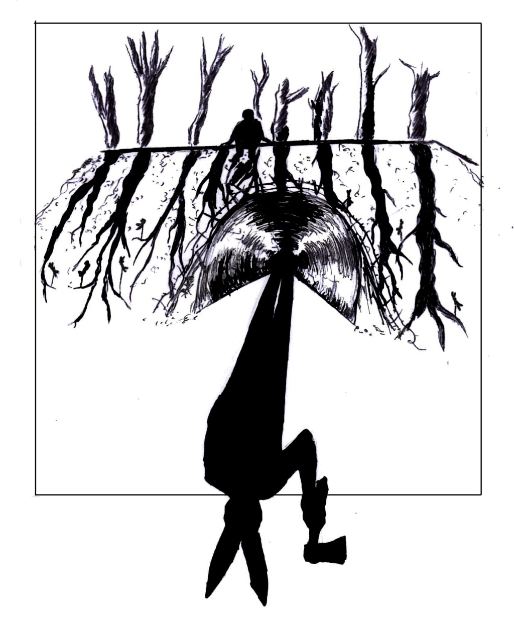 The two carried further on into the woods in silence. The trail turned, directing them into thicker patches of woods. Long, low-hung branches scratched at their jackets and fibrous fingertips tore and tangled their hair. The flashlight Martin held bounced around, guided by his frustration, initiating a dance not unlike that of a cinematic Sabbath. When the two were free of their spell, they came up to level ground where the branches hung higher.