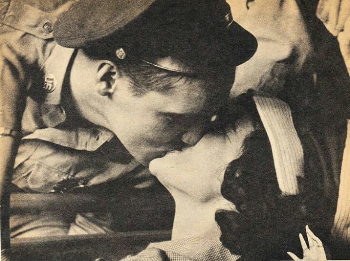 While sifting through the old ladies' boxes he finds a picture of a young couple, the man is in an army uniform.