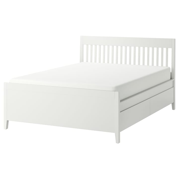 The bed frame itself is made of sturdy particleboard and fiberboard materials, with a white finish that is easy to clean and maintain. The Leirsund bed base provides excellent support and comfort for a good night's sleep, with adjustable slats that can be customized to your desired level of firmness. Assembly of the IDANÄS bed frame is straightforward and can be completed with just a few tools. The frame is designed to be compatible with standard European size mattresses, and it can be paired with Ikea's range of bedding and accessories to complete your bedroom setup. Overall, the Ikea IDANÄS bed frame with storage is a functional and stylish choice for anyone in need of extra storage space in their bedroom. Its sleek design and versatile features make it a popular choice for modern living spaces.