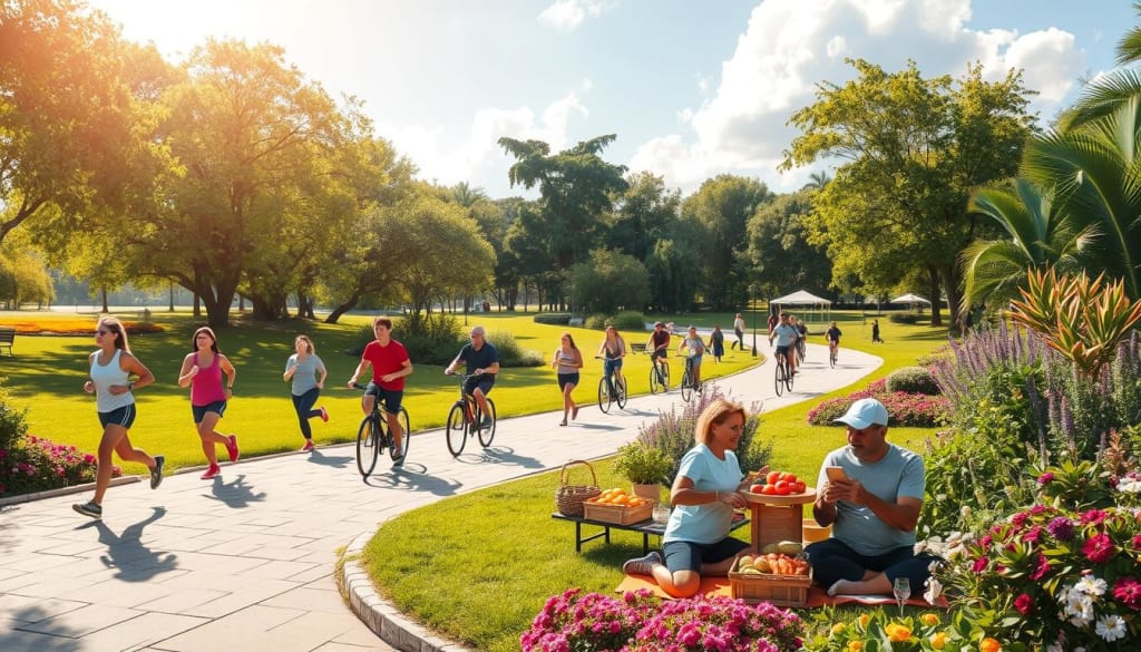 A vibrant outdoor scene depicting a variety of healthy activities: a sunlit park with people jogging, practicing yoga, cycling, and families having picnics with fresh fruits and vegetables nearby, surrounded by lush greenery and blooming flowers, emphasizing vitality and well-being.
