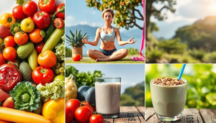A vibrant and dynamic collage of healthy lifestyle elements, featuring a colorful assortment of fruits and vegetables, a serene outdoor yoga scene with a person practicing mindfulness, a set of workout equipment like dumbbells and resistance bands in an energetic setting, a refreshing smoothie bowl garnished with nuts and seeds, and a peaceful nature backdrop symbolizing balance and wellness.