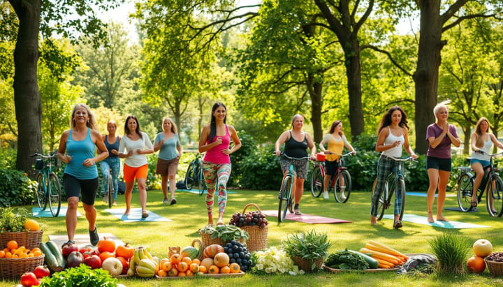 A vibrant scene depicting a diverse group of people engaging in various healthy activities outdoors, surrounded by lush greenery, fresh fruits and vegetables, yoga mats, and bicycles; sunlight filtering through trees, conveying a sense of harmony and well-being.