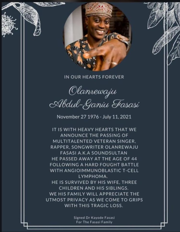 It is with a heavy heart that we announce the passing of Multi-talented veteran singer, rapper, songwriter, Onlanrewaju Fasasi a.k.a Sound Sultan.