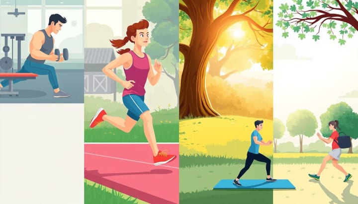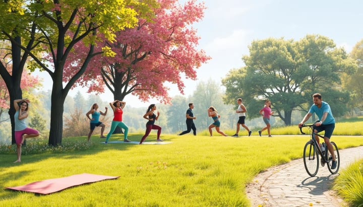 A serene outdoor scene depicting a diverse group of individuals engaging in various fitness activities, such as yoga on a grassy hill, strength training with weights, running along a scenic path, and cycling on a trail. The environment showcases vibrant trees and flowers, with soft sunlight filtering through the leaves, creating a harmonious atmosphere that represents balance and wellness in fitness.
