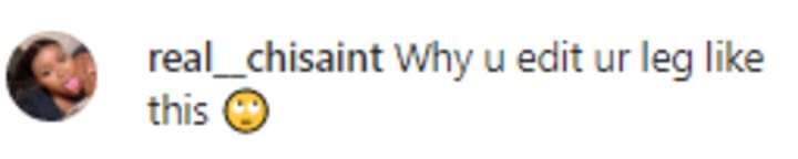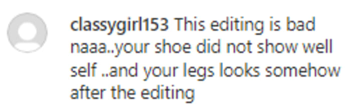 This is by far to me one of the worst photo editing jobs because not only is the edit so obvious, it's now also so bad. Eniola's legs in the photo are so badly edited that it even upon first look, it stands out in a way it shouldn't. As you can imagine, Nigerians were very vocal about their thoughts on the edit. One user wrote: "This editing is bad naaa..your shoe did not show well self ..and your legs looks somehow after the editing", while another said, "Why u edit ur leg like this 🙄". These were just a few of the many comments about the picture.