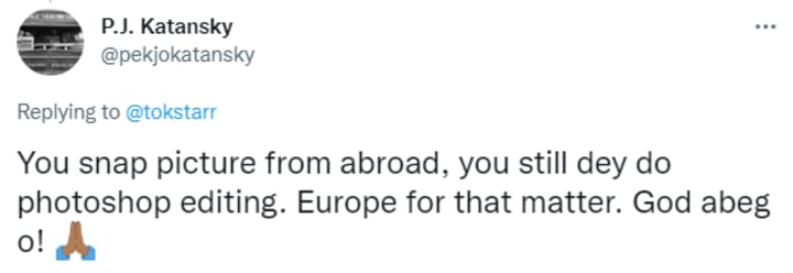 This is a very nice picture to me personally, but when Toke Makinwa uploaded this to social media, people immediately had a lot to say about the Photoshop job. One user said: "You snap picture from abroad, you still dey do photoshop editing. Europe for that matter. God abeg o! 🙏🏾" while another said "This is Photoshop not skin care "