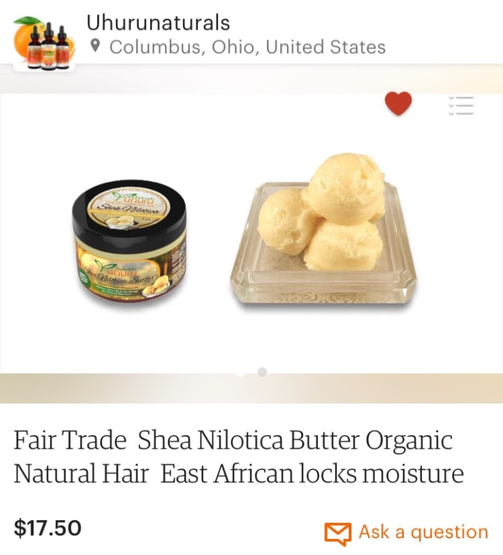 It all started when the owner got tired of chemically treated hair and decided to start over. Starting out making her own shampoo and conditioner bars, she began learning more and more. So, when a friend suggested she make her own natural products, Uhuru Naturals was born. The shea used in her products is rare in the USA and is called Shea Nilotica. Unlike its West African shea counterpart, East African Shea is "much softer, creamier, and luxurious." It is gentle enough to use on a baby's skin.