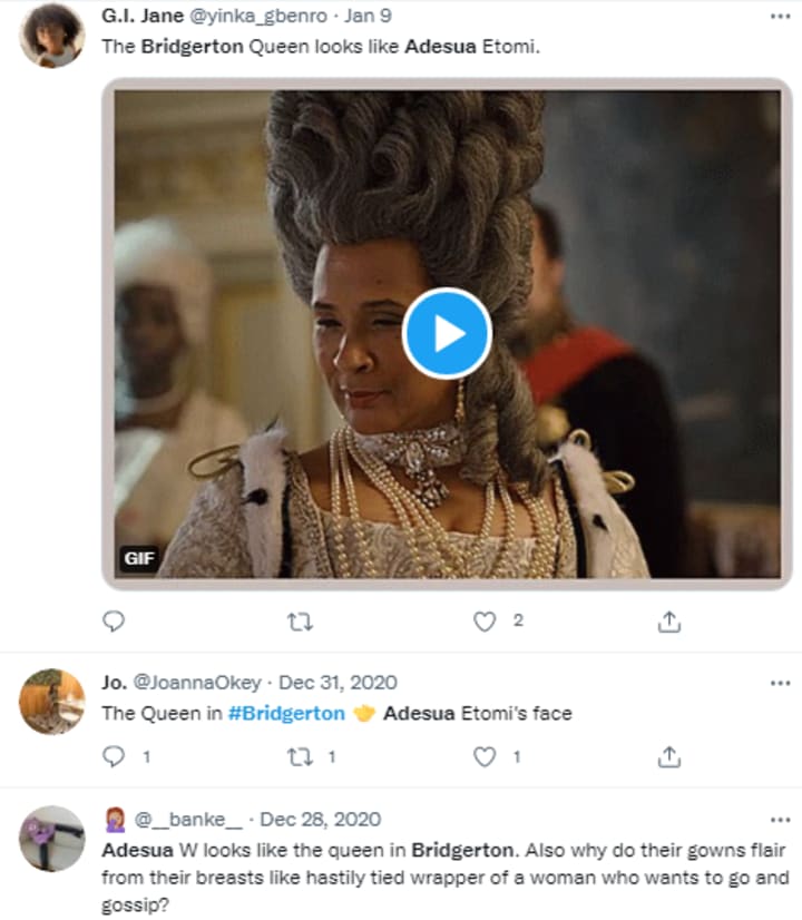When Netflix's hit series Bridgerton landed upon us, a number of Nigerians started to spy something with their little eyes. A number of people begun pointing out that the woman who acted as the queen in Bridgerton, Golda Rosheuvel, looks a lot like Nigeria's own Adesua Etomi-Wellington if Adesua were older.