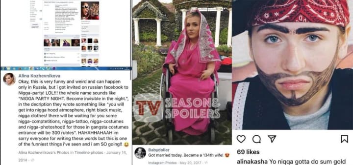 Despite Alina's insistence that a 2 photos of her dressed as a male with the N-word as a caption in the text was Photoshopped, many people and worldwide fans of the series remain unconvinced of her explanation.