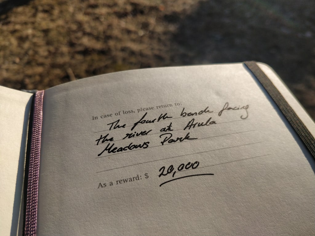 I found your notebook a couple of days ago in the very same park to which I am now returning it. I hope you’re having a good day despite everything that’s going on in the world these days. I assume this empty notebook must be quite important for you – for reasons that I cannot comprehend, but perhaps one day will grow to understand. Hopefully you’ll find your notebook before someone else does.