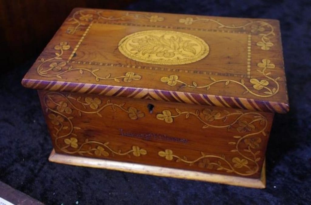 How lucky I am to have won the auction for this beautiful collection. Perfect for my husband and me, the collection contains a valet box, a jewelry armoire, and a writing box. And they’re beautiful. The dark sycamore exterior finely compliments the yellowing arbutus inlay, which further accentuates the delightful golden engravings that mask the contraptions. Nowhere in this piece does one’s eye find a space lacking in Irish charm. From the detailed portraits on Killarney gems like Glena Cottage and Ross castle, to the three-leafed clovers that spiral around the whole piece, to the harps that find a central position on every piece. It’s all just so Irish! I am so happy that the antique dealer in Liverpool found these beauties during his Dublin tour. These pieces will fit so nicely in the palace drawing-room. I hope no one minds the chip on the bottom, I did not mean to drop it…