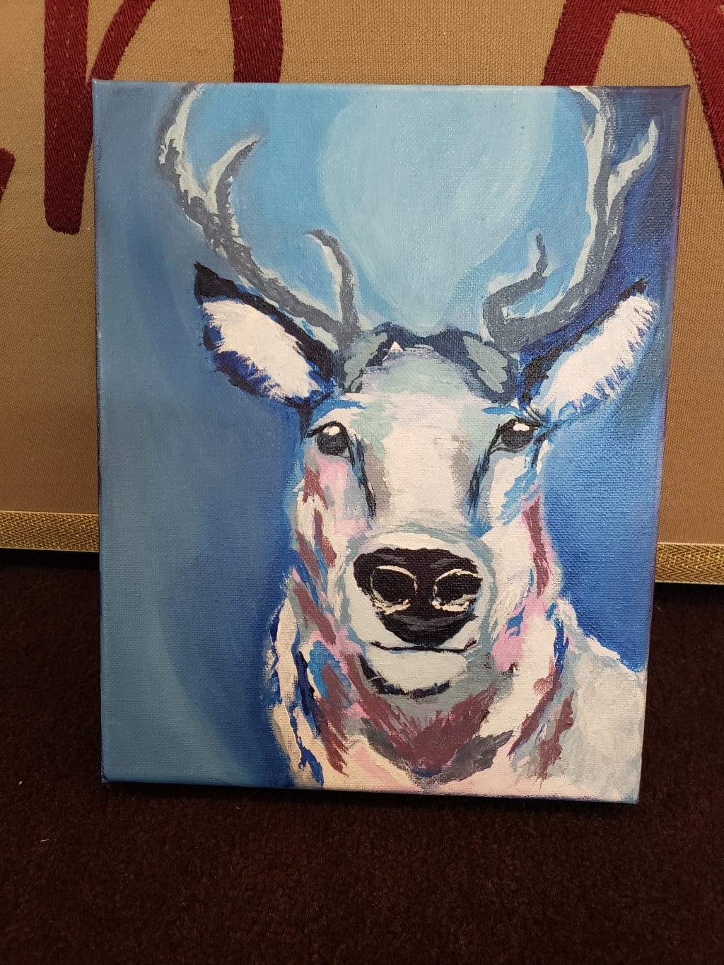 This creature was the size of a large SUV. Pure white fur, the edges of seemed to have a faint blue glow. It had enormous antlers coming from it's head, fuzzy like they too had been dusted with snow. It's eyes were gently, as if I was staring into my grandmother's eyes. The ears were large, but didn't look out of place.