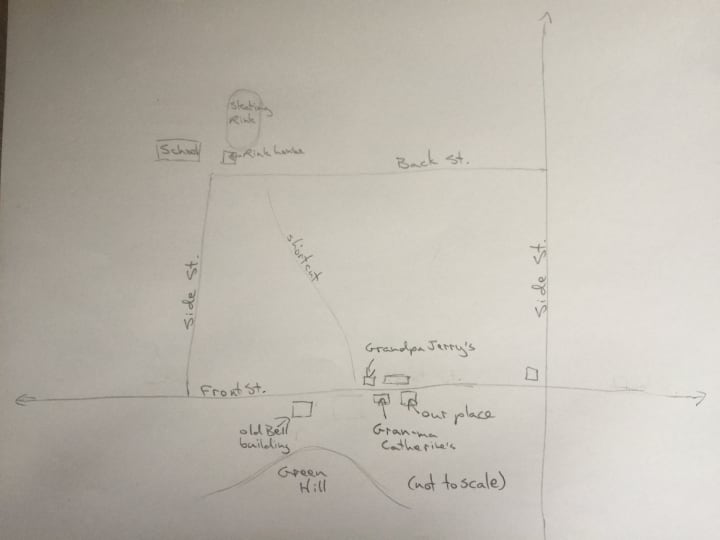 Grampa Jerry's was at the beginning of the shortcut through the big field filling the main block, where the fair set up when it came to town. Here, let me draw you a map: