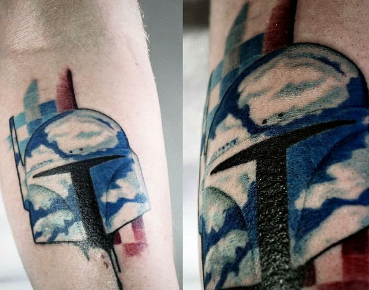 My brief to Tarly for my first tattoo was 'simple'. I wanted a piece that combined my favourite Star Wars character, Boba Fett, in the style of my favourite painter, Rene Magritte, and which conveyed the pain of mental health and the problems of my past and Dad’s present. Simple, right?