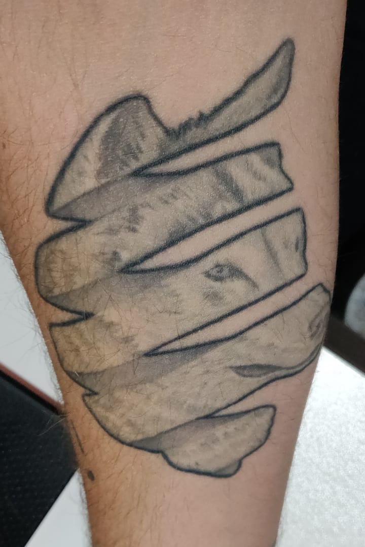 Again, I went to Tarly Marr with a brief. I told him about the wolf shirt. I told him about Penmon lighthouse on his home of Anglesey where we used to visit. And I asked if he could once again link it to another of my favourite artists, M. C Escher. And once again he delivered in image what my heart could not say. A lone wolf in black and white unravelling as my heart and mind had. A tattoo that allowed me to grief and now which every time I look at reminds me that the most demanding walk you ever make is the one you make alone.