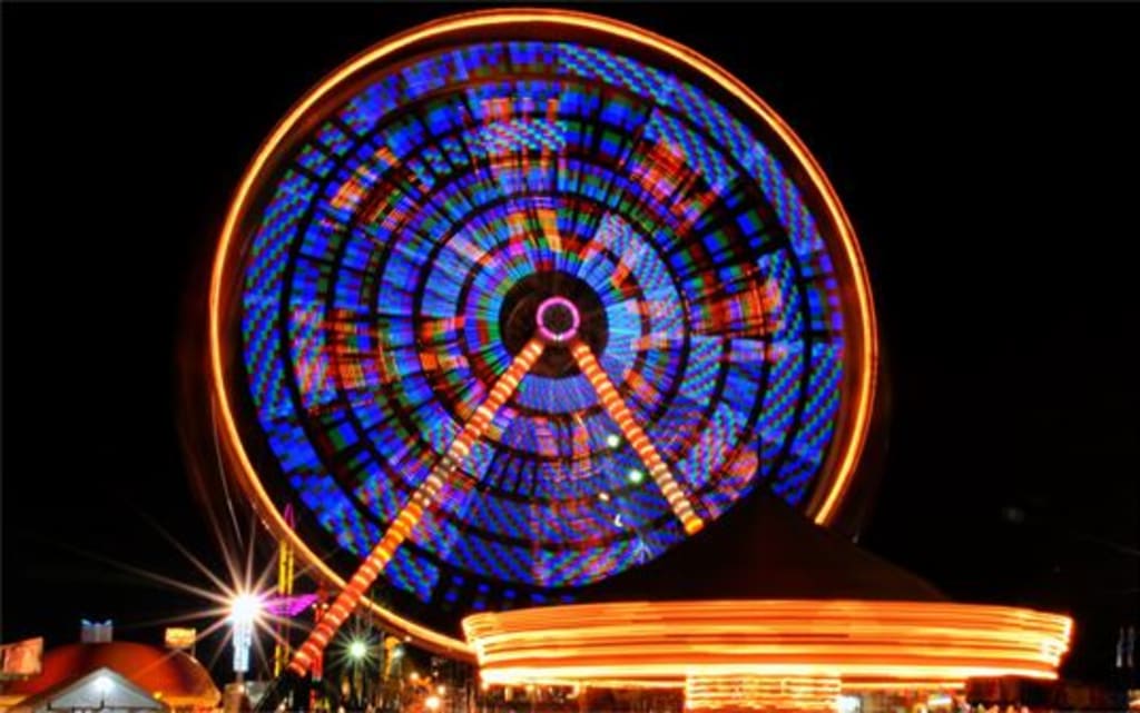 The American Dream seems like it goes as far as a spaceship to the moon. But it stops halfway there. I am afraid of heights. Once I get on the ride, Kris grabs my hand and he says he is afraid of heights. I tell him that I am afraid of heights too. His hand feels warm even though the temperature is dropping. The ride starts and I shut my eyes and just listen to the wind whistling in my ears and the different walks of people around me screaming. I decide to open my eyes and look at all of the purples and blues as my eyes cross to try to see every color in the book. Most people say space is black. I saw black, white, red, blue and purple that night. I do not know whether it was the fast movements of the ride or just my senses giving out.