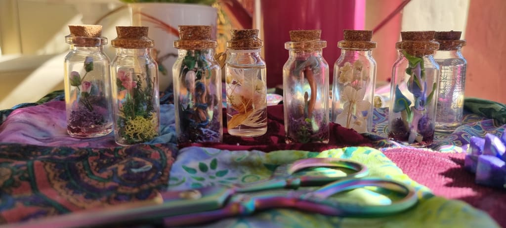 Then, one day, I saw one hundred tiny glass bottles. The potential for faerie aesthetic on an even smaller scale sang its siren song. Nervously, I added the bottles to my cart, and all the tiny accessories I wanted to go with it. The packages came rolling in, and so the creation process began...