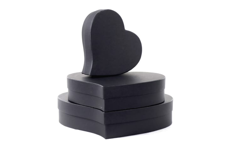 I took the package somewhat confused by his actions. He had never acted like this before, so his strange actions felt weird. I looked down at the pretty purple gift in my hands and began to open it. Slowly, a box was revealed causing my eyes to look up at him as he brought his hand up to the back of his neck. He seemed somewhat embarrassed but was still standing tall. I looked back down and pulled the flaps open to find three black heart shaped boxes within. Butterflies filled my stomach as I looked back up at him.