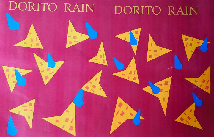 Over the past summer the younger brother went to Media Camp. He loved working in the media room; one day he arrived to pick up like 10 minutes late--he apologized for the delay, admitting he had been in the zone in the media room and hadn't realized what time it was. I wasn't bothered by it; his brother and I had happily chatted while we waited. I was glad he enjoyed the camp and had the chance to tap into his creativity. He's quite the creative individual, but he doesn't always pursue creative outlets. He was incredibly proud of his "Dorito Rain" piece he made--it was even feature on the camp's webpage, and his friends all wanted a copy of it. It’s a really neat art piece, and my friends adore it, too.
