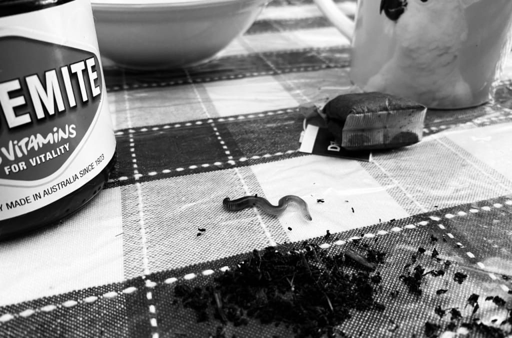 At home I check that Mum’s car isn’t in the carport before emptying my worm bucket onto the kitchen table. Six worms of various sizes wriggle and squirm between the coffee cups and Vegemite jars, seeking cover from the light. I retrieve them and repeat the exercise several times, watching the way the worms move. This year I’m sure I can pick a winner. I zero in on a short, fat, red worm that consistently outmanoeuvres my probing fingers. Flicking through my notebook to my list of winning worm attributes I can see that she fits the bill. Speedy, diving for shelter. She’s the one. Recognising her as coming from Ms Prudence’s rose garden I give her a name in tribute, and pack Prudence the worm into a plastic lunchbox, adding a slice of apple.