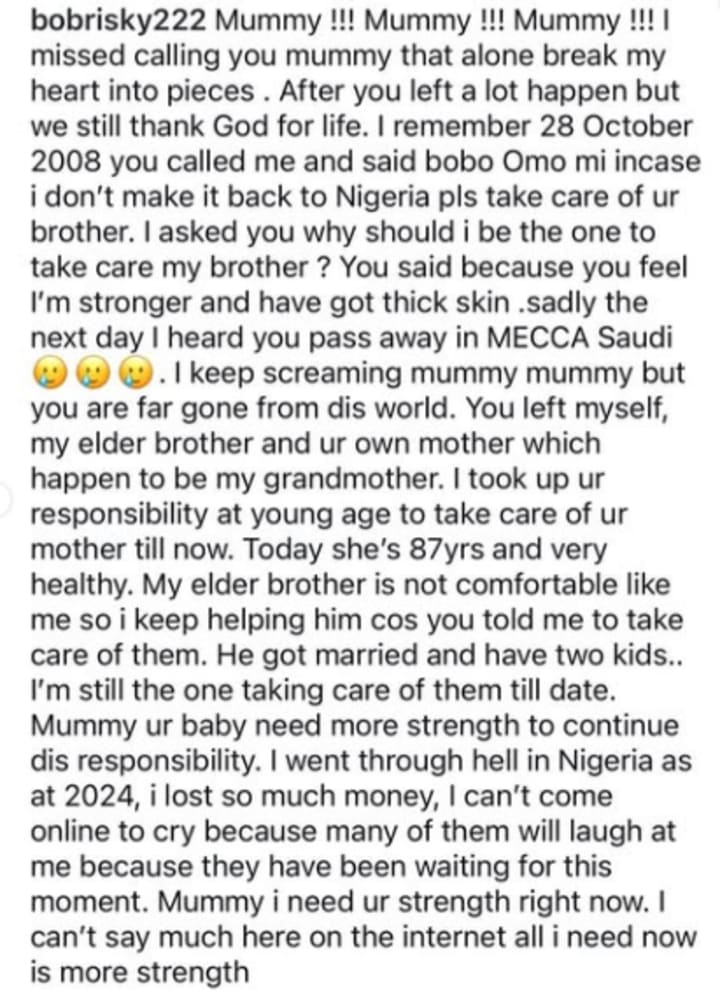 BOBRISKY: Mummy !!! Mummy !!! Mummy I missed calling you mummy that alone break my heart into pieces . After you left a lot happen but we still thank God for life. I remember 28 October 2008 you called me and said bobo Omo mi incase i don’t make it back to Nigeria pls take care of ur brother.