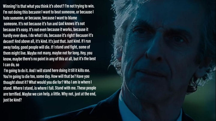 "Winning?! Is that what you think it's about? I am not trying to win! I'm not doing this because I want to beat someone or because I hate someone or because I want to blame someone. It's not because it's fun and GOD KNOWS it's NOT easy! It's not even because it works because it hardly ever does! I do what I do because it's RIGHT! And it's decent. And above all, it's kind. It's just that. Just kind. If I run away today good people will die. If I stand and fight some of them might live. Maybe not many, maybe not for long. Hey, you know, maybe there's no point in any of this at all but it's the BEST I CAN DO! So I'm GOING TO DO IT! And I will STAND HERE DOING IT TILL IT KILLS ME! You're going to die too, some day. How will that be? Have you thought about it? What would you die for? Who I am is where I stand. Where I stand, is where I fall. Stand with me. Maybe we can help, a little. Why not, just at the end, just be kind?" - the 12th Doctor