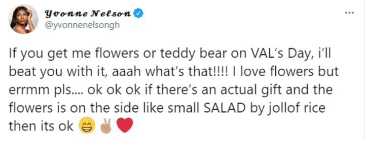 If you get me flowers or teddy bear on VAL’s Day, i’ll beat you with it, aaah what’s that!!!! I love flowers but errmm pls.... ok ok ok if there’s an actual gift and the flowers is on the side like small SALAD by jollof rice then its ok