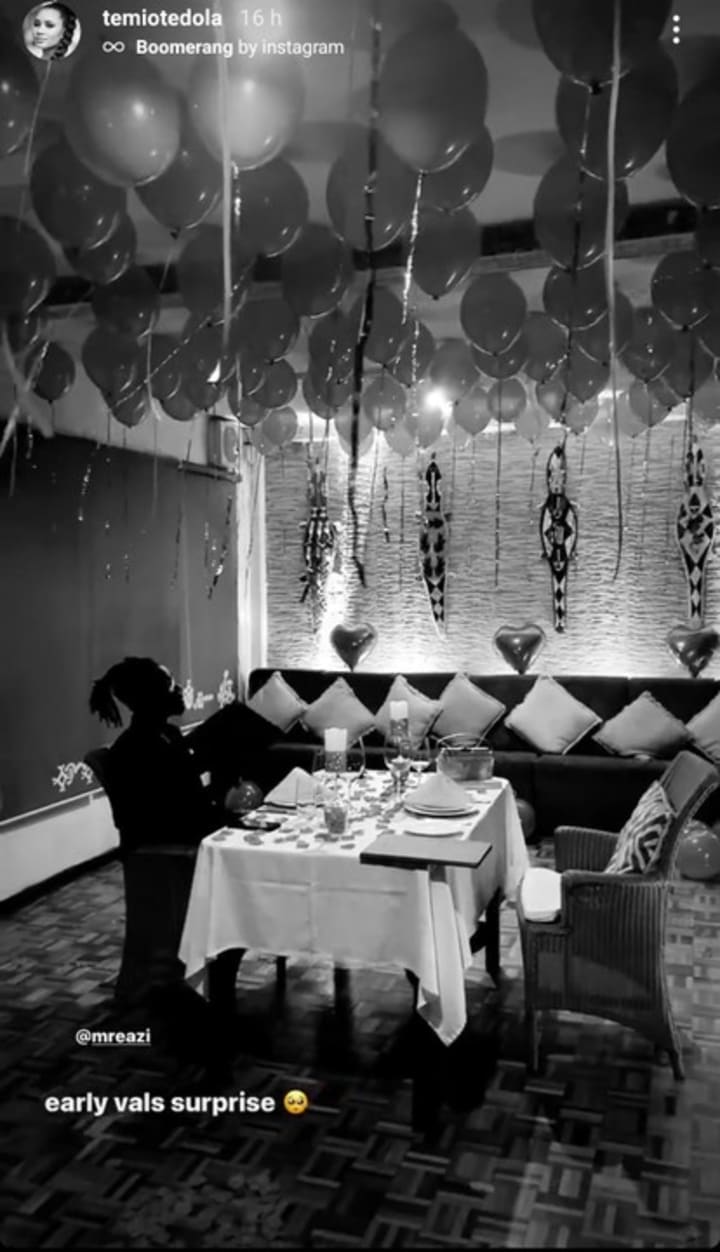 Mr. Eazi treated Temi to an early Valentine’s surprise. He set up a very lavish lunch date complete with balloons and a trumpeter --- and this is all before the actual Valentine’s day. I’m very excited to see what he’ll actually do for Valentine’s day.