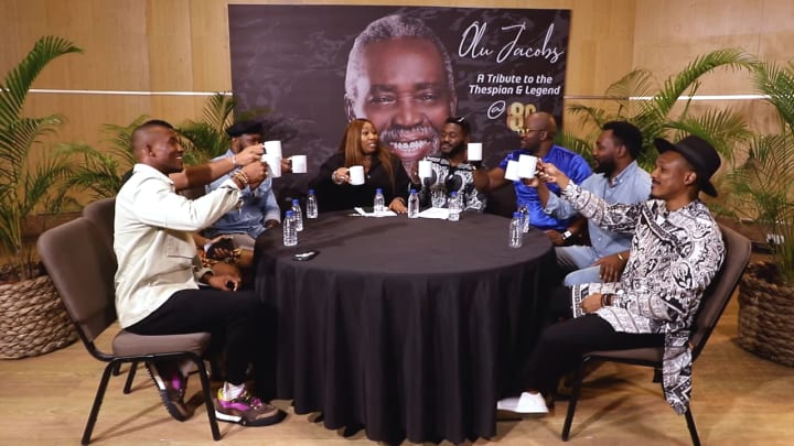 Still, there is no reason to cry, especially during the celebration of this massive milestone. The incredible actor turned 80 on the 11th of July and in celebration of the monumental moment, seven Nollywood actors sat down to pay their respects to him. Actors Deyemi Okanlawon, Desmond Elliott, Stan Nze, Tope Tedela, Shawn Faqua, Gideon Okeke, and Benjamin Touitou all gathered around a roundtable to talk about what makes a legend, why Olu Jacobs is a legend, and the words that come to mind when they hear his name. Here's what was said.