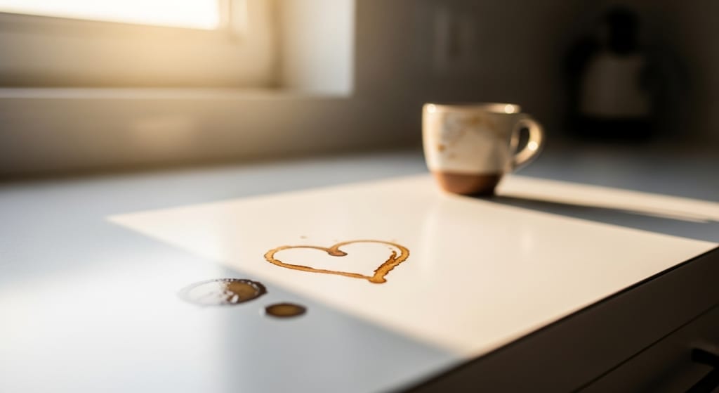 A faint giggle escaped her. It was then she noticed it. Nestled among the coffee stains, a small, dark splash had taken on an almost perfect, albeit miniature, heart shape. A tiny, serendipitous heart, born from chaos. She traced its outline with her finger, a faint smile touching her lips.