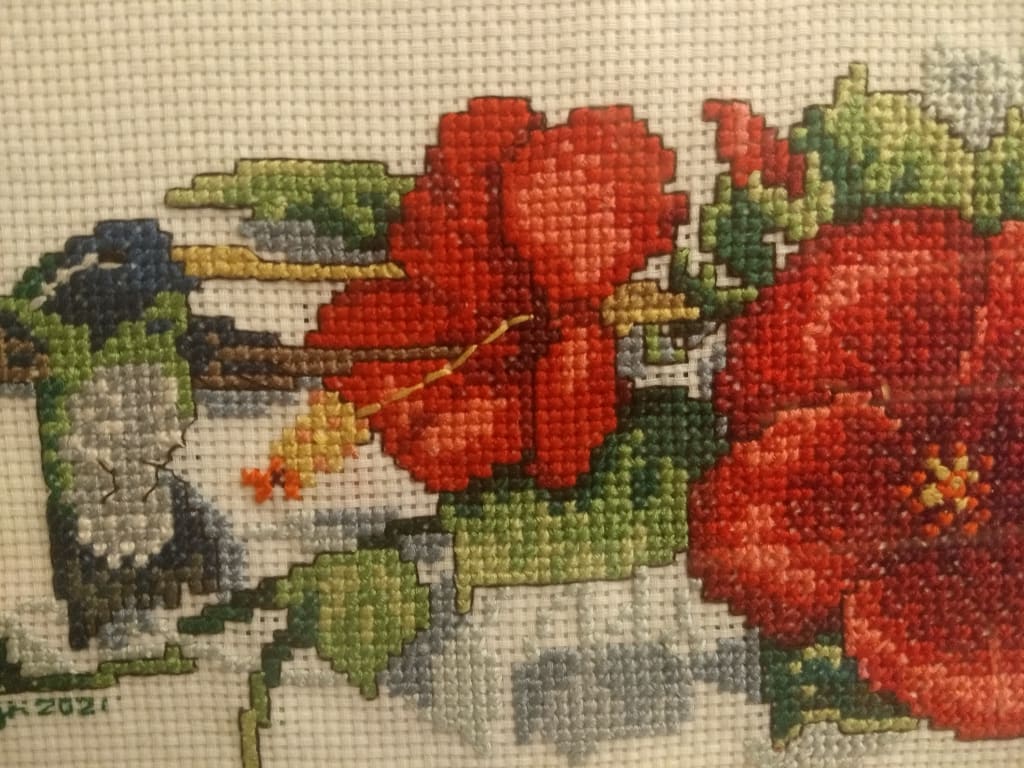 One year later, I am writing this story in July 2021. During this year, I finished my four holiday projects. Then I completed a cross-stitch kit featuring a lovely pair of red hibiscus flowers with a hummingbird, neatly displayed in a white wooden frame. A new sampler is now underway, although I've changed the terra cotta floss for a rich burgundy, DMC #815. When working a kit, I like to exercise my imagination and switch out colors and vary the stitches.