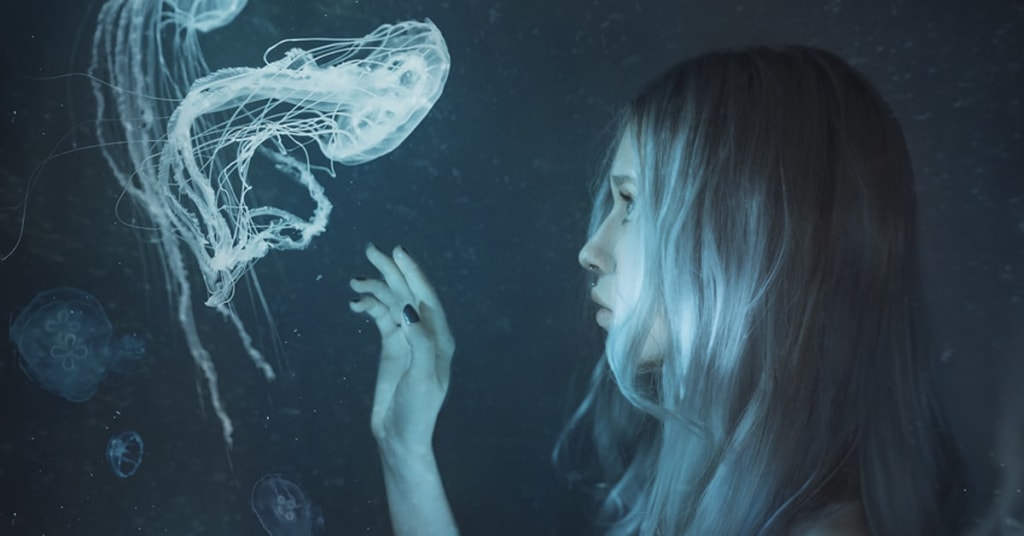 I took a feeble step forward and realized that the glow was coming from a jellyfish. It lay in front of her as if the ocean had cooked it up itself and served it onto the sand as an offering to her. Satisfied, I came up next to her and knelt down to take a closer look.