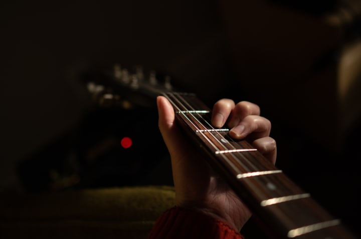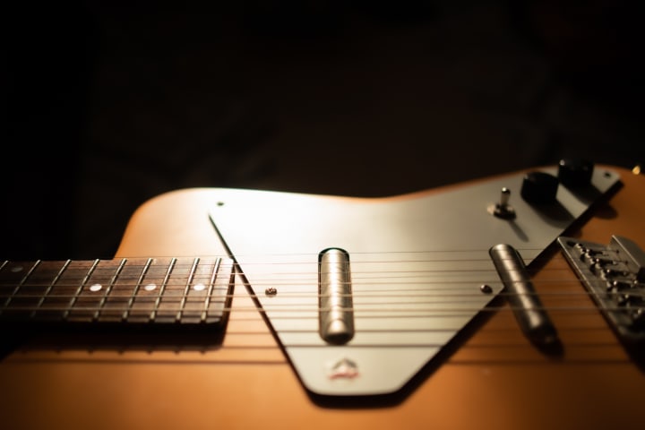 Reminiscing on this green throne, with the sun's volume on full blast, I pick up the creamsicle-orange electric guitar. It's a Danelectro, a Korean knockoff, made in the 90s. They used to sell these at Sears, cheap department store guitars made for beginners. It's not exactly a top tier instrument - it lacks the curvaceous grace that more expensive guitars possess. Blocky and retro-futuristic, it looks like something one of the Jetsons would noodle around on.