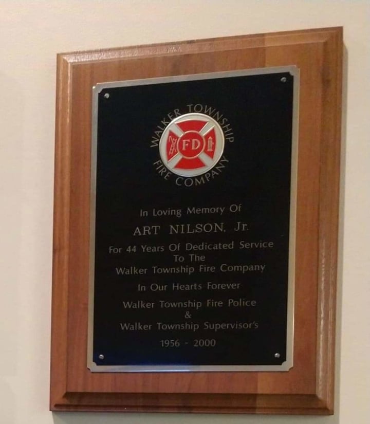 Recently, a relative snapped some pictures at the Walker Township Fire Company building that we referred to as the fire hall. Inside the fire hall on the wall display, there was a plaque. Did you know that you were honored with a plaque? With forty-four years of service, there is a plaque in your HONOR that is displayed at the Fire Hall!
