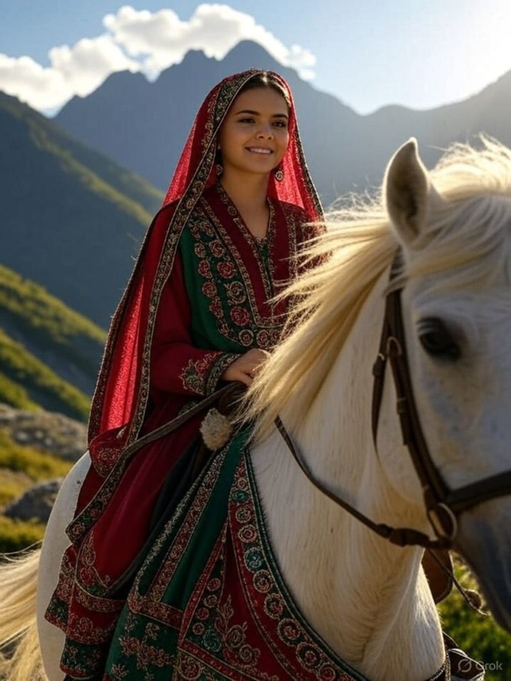 It's Friday afternoon, but you couldn't imagine many high clouds scudding in from the west and plenty of sunshine. In the last shreds of summer, while riding a white horse as her companion, she embarked on an unforgettable journey through rugged mountains. She was very passionate about social justice issues. She spoke with great compassion and vigor. Her eyes were the color of sea foam. Her voice was like warm molasses poured over fluffy brown sugar. Her skin is golden-brown, with a subtle rosy glow around her cheeks. While mounted on a horse, she thought she heard a whisper, but no one was in sight. Even though she was afraid, she mustered up the courage to see the matter through.