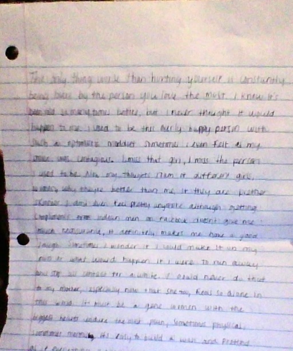 "The only thing worse than hurting yourself is constantly being hurt by the person you love the most. I know it's been told so many times before, but I never thought it would happen to me. I used to be this overly happy person with such an optimistic mindset sometimes I even felt as my smile was contagious. I miss that girl, I miss the person I used to be. Now my thoughts are intruded with other girls, women, why they are better than me, if they are prettier than me, if they are skinnier than me.. I don't even feel pretty anymore, or like myself at all. Sometimes I wonder if I could make it on my own, or what would happen if I just ran away and stopped all contact for a while. I could never do that to my mother especially now that she too, feels so alone in this world. It must be a curse, woman with the biggest hearts endure the most pain, sometimes physically, sometimes mentally. It's easy to build a wall and pretend if everything is okay and act like nothing really bothers you anymore. I think I have become accustomed or maybe I am just becoming numb to it all. Oh what I would give to feel alive again to feel wanted, appreciated, just loved. Sometimes I find myself roaming off and just thinking about my happy place, being home with my family, hanging out with my siblings and pretending that I am not hurting deep down inside. I could never do that to them, I want them to be happy and I would never let them know that I am not okay and cause them any worry at all. My nephews bring a feeling of love, and peace to me I don't have kids of my own, but they pretty much are mine I love them like they are, and like any aunt should. I find myself constantly fighting, over thinking and just worrying about every single thing around me. It is as sometimes I find that courage that I so desperately need but somehow it always ends up being broken down into those little tiny pieces that could never be enough. Drinking is a coping method many turn to, including myself. Yes it's understood what is happening to my body with each consumption, but I don't care. It makes me feel good, and it helps forget those intrusive thoughts. Some nights I stare at the window with hope that prince charming will come on his white horse and save the day. Save me and take me somewhere I could be alone. A clean slate, a clean life, no one would know me or where I came from. I quickly come back to reality because all that is doing is making me feel worse about the life I have allowed myself to live, how did I get in this position, why me? I was the sweetest person before this relationship, now i'm unrecognizable to myself. The level of angry I could reach has been tested and I scared myself. It was like something came out of me that had been hiding under my skin the whole time. It was waiting to burst, and he brought it out of me. I will leave, I have too do this for the sake of my sanity. Maybe I'll call my mom tomorrow, but what will I say mom can you come get me a thousand miles away from home? I'm ashamed of the circumstances but that's it for now. I'll be back and let you know how things go."