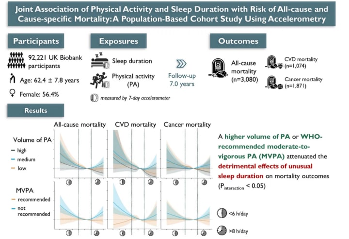 In the participants that got by with the least amount of sleep or too much sleep, the least amount of physical activity increased their mortality risk by 16 & 37%.