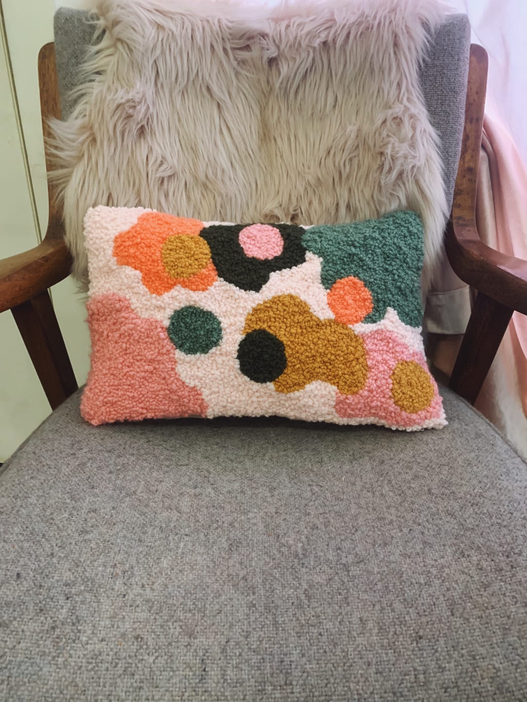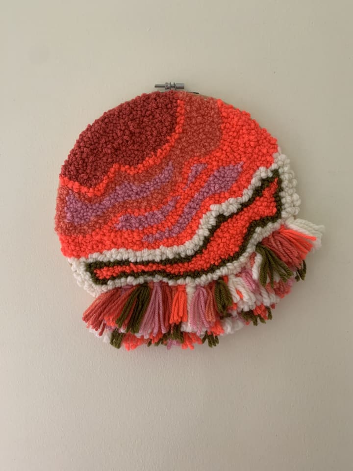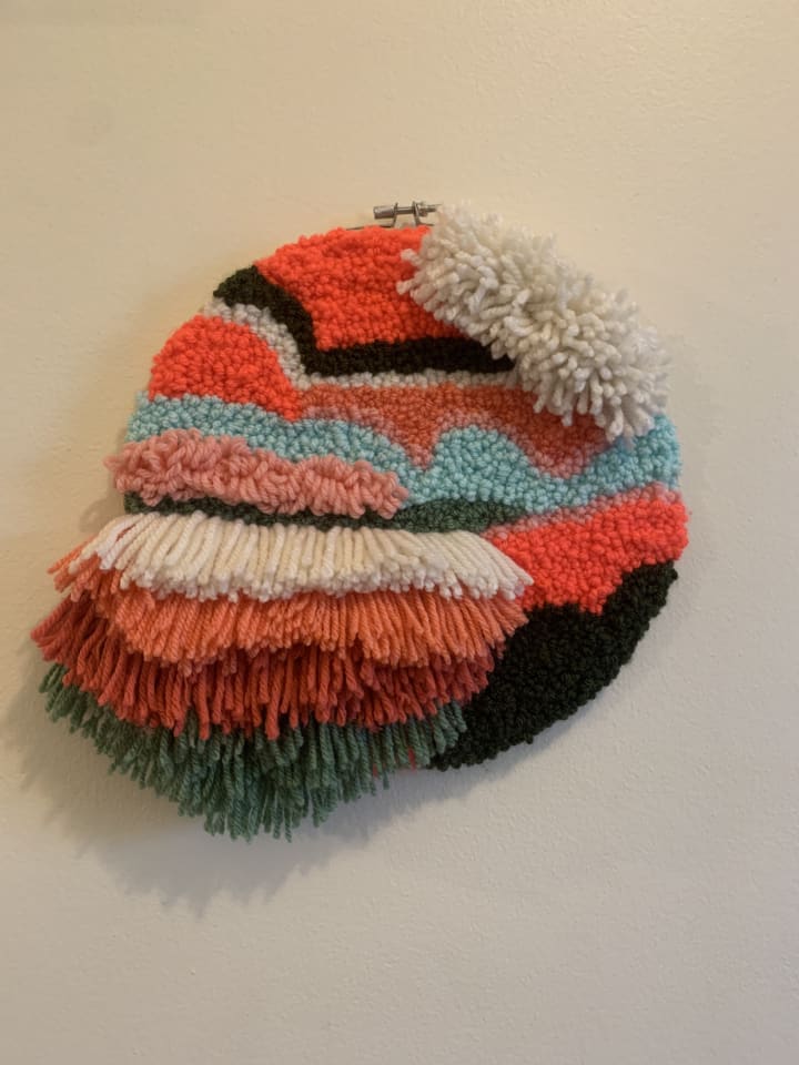 My knitting, embroidery, and needle punching bring me back home on any given day, even when the idea of home feels unreachable and murky. Even on the afternoons and evenings when my mental illness is leaving me overwhelmed and out of emotional tools, the steady punch of the needle, the tugging, looping, trimming of the yarn call me back into my body. Through shapes and bright colors my hands can slowly calm, my breath finds it beat, and I am called back to the present by the blank canvas in front of me.