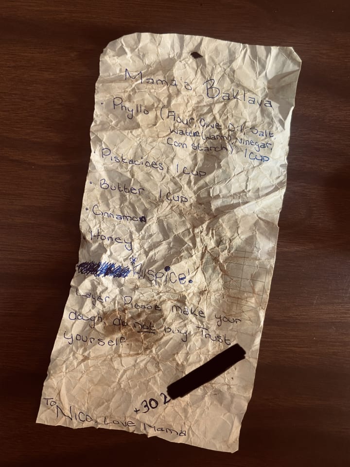 The next events were a blur, but they aren’t all too important anyway. We left the beach shortly after that. My cousin got into a fight with the same girl that pulled Nico away. Someone called the local security and we scattered, as college kids tend to do. The next day I finished packing my room and officially moved out of my dorm. I’d been charged a heavy late fee for moving out a day late, but I was already $20,000 in debt. What’s an extra hundred? I moved back home for the summer and the following school semester, got an apartment in Texas with a friend. She was going to Texas A&M for her masters and I’d decided to throw away 4 years of studying biology and went to culinary school instead. I’d left the bulk of my belongings in my mother’s shed in California and, though I’d kept telling myself I’d go back for them, for another two years, I didn’t. My mom eventually moved to another suburb and sold her house, so that winter, I had no choice but to drive down and pack my things. My junk consisted of mostly shoes and purses that I had to have at the time, but at the bottom of everything was that beach bag I had the night I made the baklava with Nico. I held onto it for a bit reminiscing, before noticing a strange crinkling sound coming from the bottom of the bag. I had emptied it out completely except for the piece of trash Nico had given me. Except, now, it looked more like an old grocery list than trash. I opened it, just for the sake of being nosey. Nothing out of the ordinary was written on it, mangoes, rice, flour; but on the other side were the instructions for “Mama’s Baklava” along with Nico’s phone number.