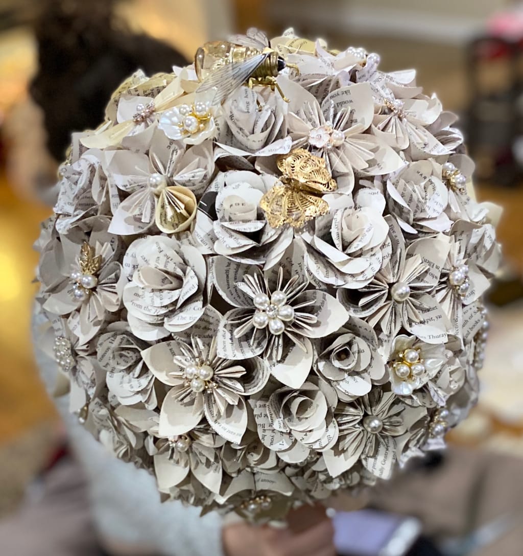 Fast-forward a few more years and it’s one year before my wedding. The thought of those beautiful flowers I dreamt of wilting away and dying made me want to create flowers that could last forever. I wanted a keepsake to remember that day for the rest of my life. It would not be my wedding and it would not be me, if I didn’t craft something big. All of my bridesmaids carried flowers that I created out of satin ribbon and the groomsmen had boutonnières also made from satin ribbon. Everyone else had flowers created from old books. My future husband had a boutonnière of roses that were created from old book pages. Both my parents and my future mother and father in law had paper flower boutonnières and corsages. The aisles and tables were decorated with paper flowers. Even the flower girls had special paper kusudama flower balls of their own. My biggest project and best of all, was my massive bouquet. I could not wait to walk down the aisle with my most meaningful and favorite project I had ever created in my life.