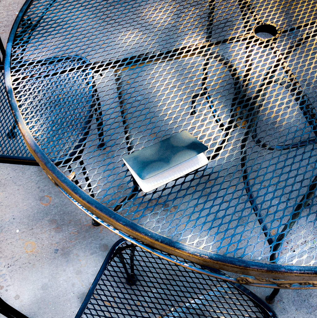 Feeling both restless and drained, I close my eyes for a moment. I give up fighting and just let this weight take over me. I muster the energy to stand up and drive back to my bare apartment and maybe nap before trudging to work, but as I stand to go, I spot a small black book out of the corner of my eye. It looks like someone’s pocket journal left near the edge of the table across from me. I’m surprised that I didn’t notice it before. I glance around to see if anyone’s missing it, and half think to possibly find its owner or give it to the barista inside, but I’m the only one who’s been out here in the last half hour. I have no idea where it could’ve come from. I feel a touch of shame that I want to snoop on someone else’s private thoughts, but something urges me to read it.