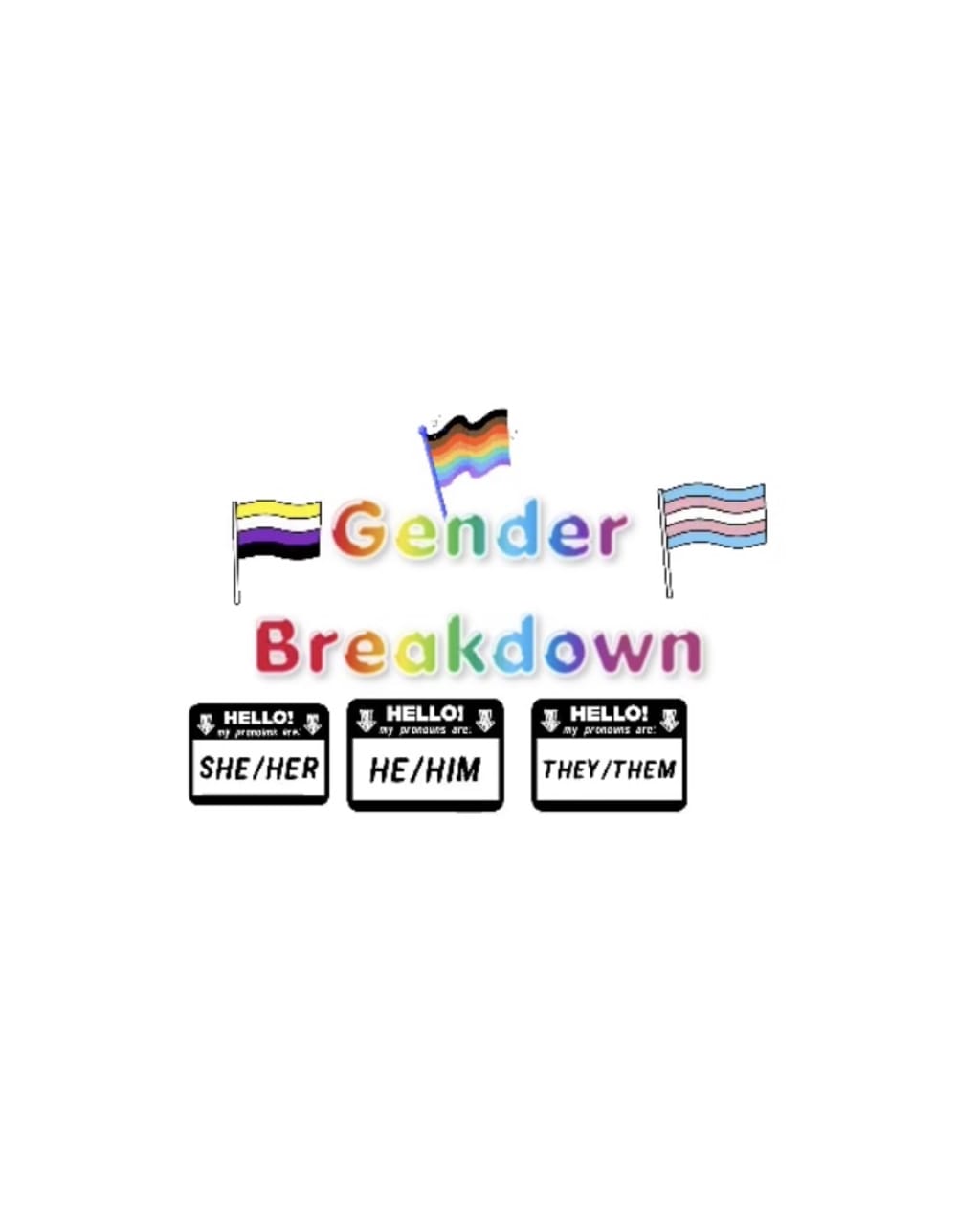 Now obviously not everyone is cisgender, or I wouldn’t even be writing this article. So, what about people who are not cisgender? The definition of transgender is someone who’s gender identity does not match identically with the sex they were assigned with at birth. Which means whoever is not 100% cisgender, falls under the term transgender. The transgender pride colors are blue, pink, and white. The flag is made of stripes in the colored order of blue, pink, white, pink, and blue. Usually people who use these pride colors and this pride flag are transgender men and transgender women. However, everyone else who is not cisgender can still use these as their pride colors if they like, because they do fall under the term transgender. This includes people who are non-binary, genderfluid, demigirl, and demiboy. Those are the identities we will be discussing today.