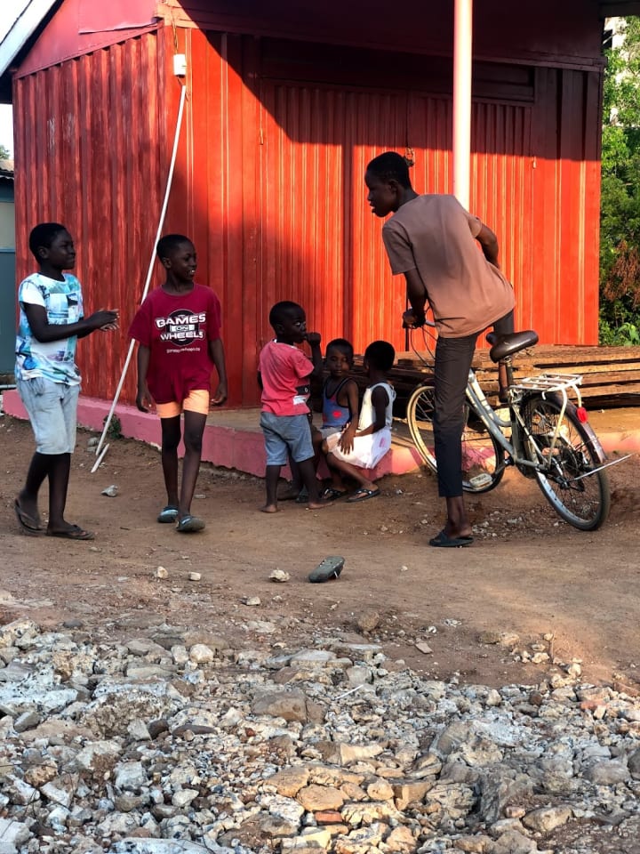 Once watching children ride their bikes on an unpaved rocky road, next to a cliff with which was more than a 50-foot drop, I was scared, I said “be careful!” Kwabena laughed so hard at me, I was extremely nervous.