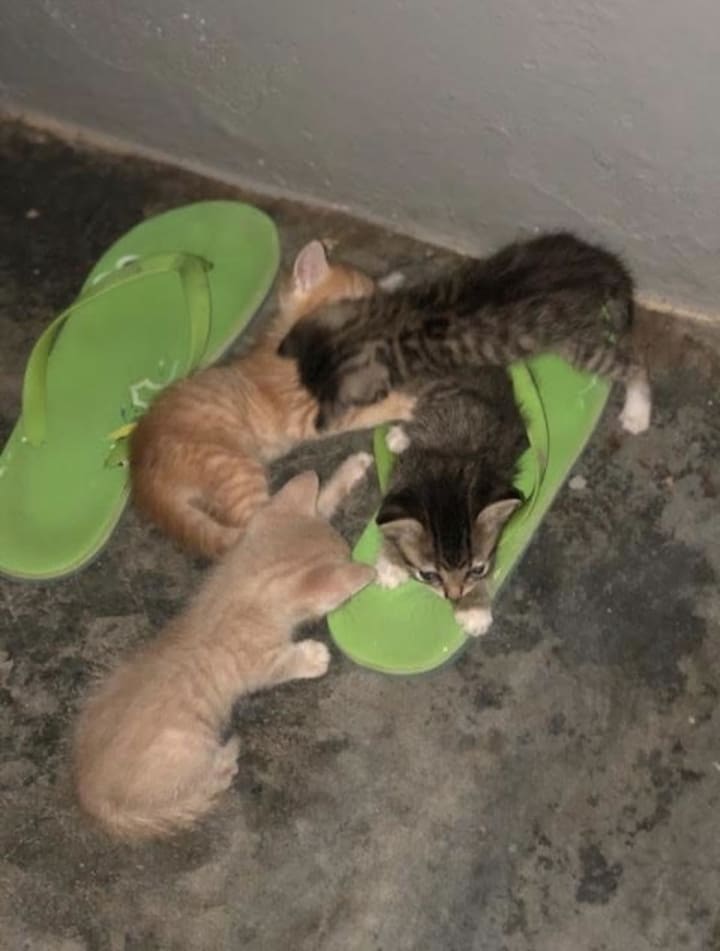 There was a mother cat with five kittens. I went out one day to slip my feet in the “Chaley wotes” (pronounced as Charlie Wa-tay) slang for flip flops. I noticed they were being used by the tiny residents as a play place.