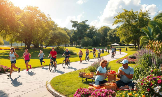 A vibrant scene depicting a diverse group of individuals engaged in various fitness activities, such as running, cycling, and practicing yoga in a sunlit park. The background features lush greenery and colorful flowers, with motivational elements like a sunrise breaking through the trees and a sense of energy and determination in the atmosphere.