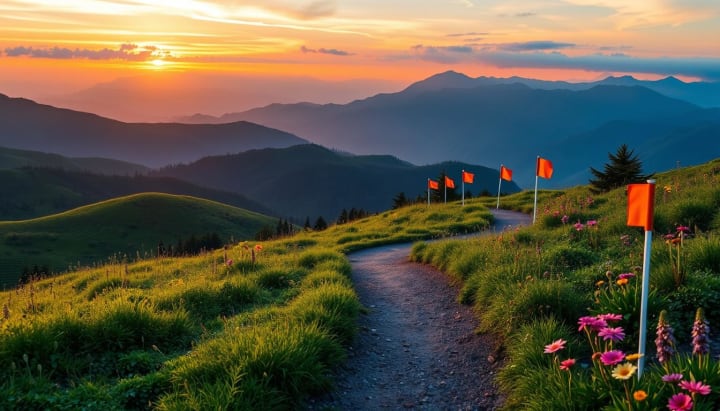 A serene landscape featuring a winding path leading towards distant mountains, symbolizing a journey. Along the path, various milestones marked with small flags, each representing a fitness goal. Lush greenery surrounds the path, with vibrant flowers symbolizing growth and progress. The sky is painted in warm hues of sunrise, evoking a sense of hope and new beginnings.