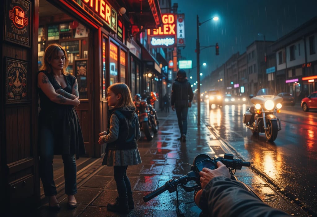 The storm hadn’t let up outside. Razor kicked his motorcycle to life, the engine growling like a beast. The girl climbed onto the back, her small hands gripping his vest as they sped through the slick streets.