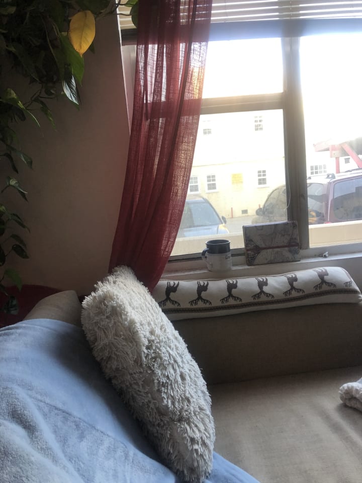 The “spot” is located inside my studio apartment which is located in the heart of Hollywood, California. My apartment is wedged in a little corner that is between two very busy and loud avenues. Somehow, however, there seems to be some kind of sound-proof cloud around my apartment. All is calm and all is quiet right outside my window. Less than a block away, there may be rioting, homeless people yelling, cars honking; but my little block is surprisingly peaceful. Here, despite distant sounds, everything feels totally quiet. I am able to tune into my environment and listen to the birds, the wind rustling the trees, and the sounds of my own breath.